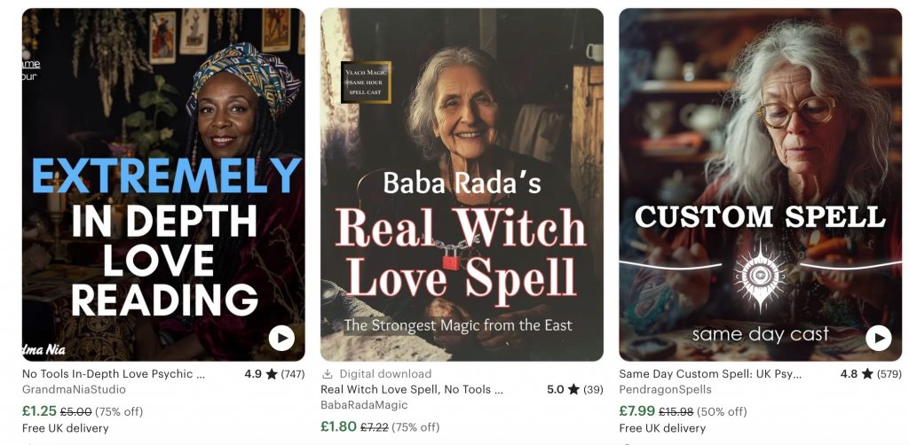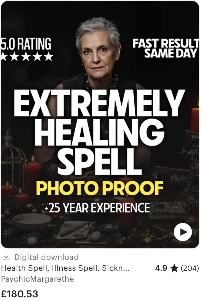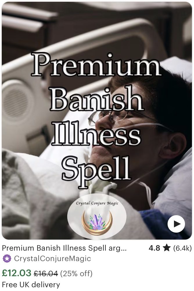 One customer bought a “Banish illness spell” from ‘CrystalConjureMagic’, after struggling to diagnose and treat a health condition. “The seller took my details and vanished,” she says. “I think they’re just laughing at me […] Undiagnosed conditions are hard, and people like you just bring out our desperation.” The shop offers a variety of other health spells, including “premium” versions that cost a few pounds more. They have received over 35,000 sales.