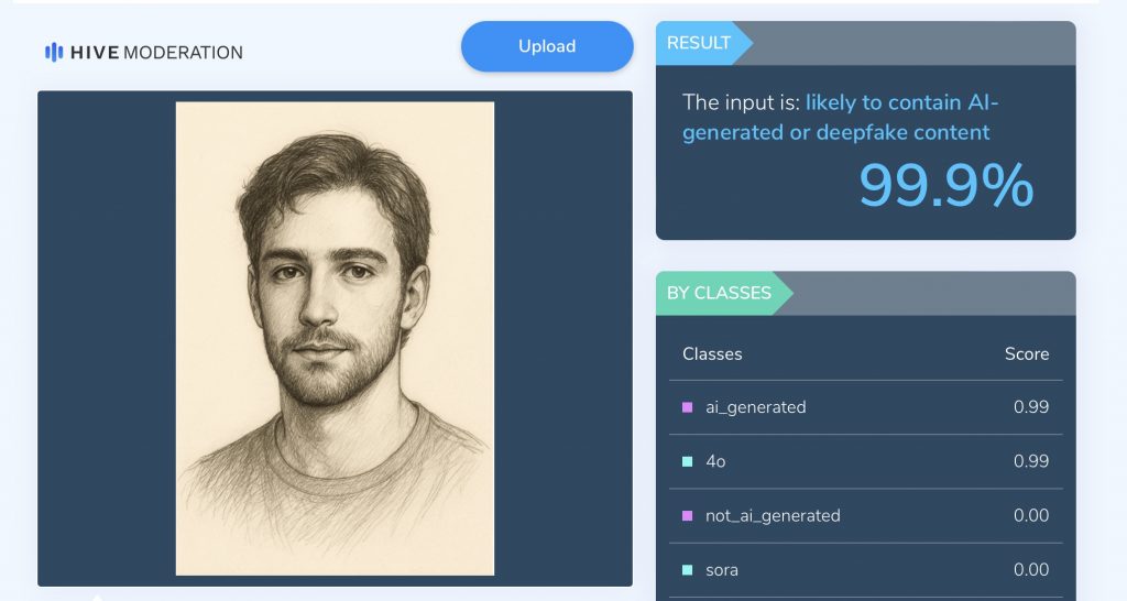 Less than 24 hours later, a “sketch” arrives in my inbox, and it’s immediately clear that it’s AI-generated, just as expected. If you don’t believe me or somehow can’t see the huge red flags, I run it though Hive Moderation’s AI Detection, which determines its AI likelihood at 99%. It’s frustrating to see the sheer number of fake psychics hiding behind this trendy facade of mysticism, and the fact they’re raking in thousands from a sketch created in less than a minute.