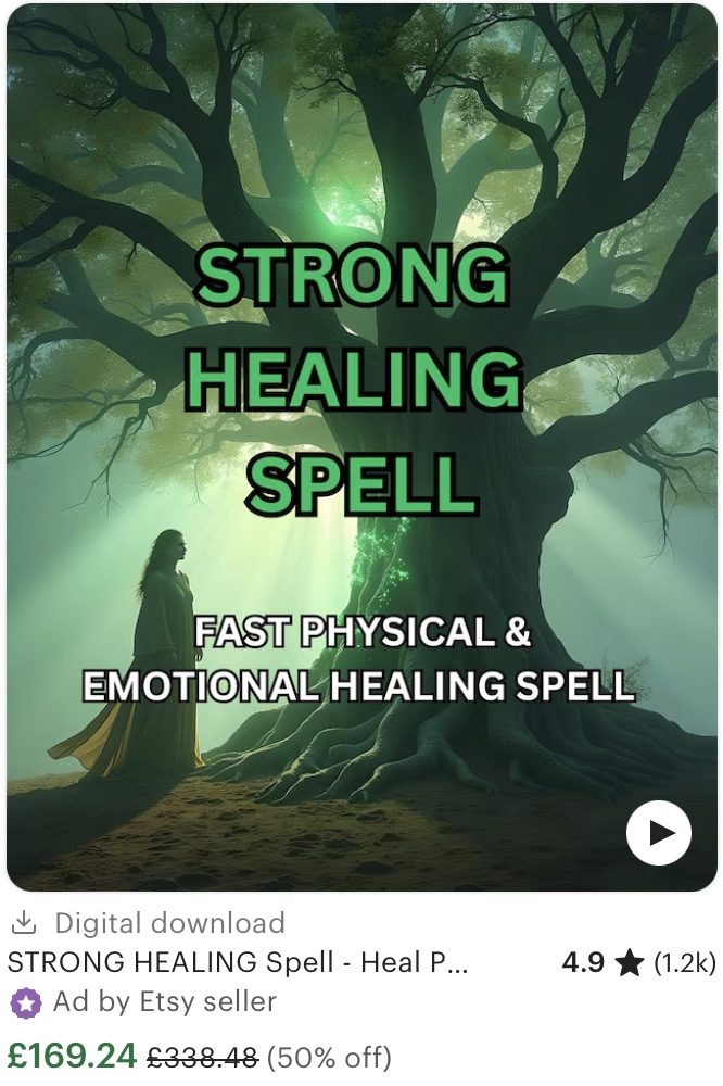 Etsy is also directly profiting through these health spells. Beyond charging fees on each transaction, the platform makes money through seller ads. When you look up anything on Etsy, the top-right corner shows how many promoted listings appear. Sellers pay the site directly to boost their product, a higher fee for a higher placement, or how many times the product is recommended. A search for “health spells” reveals 1000+ seller ads, and though many are other items added by the algorithm, most are spells claiming to heal illness. In theory, if you flag an account for harmful misinformation, the site should take it down. In practice, a concerning amount remains.